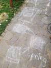 Ich habe heute mit unseren selbst gebastelten Straßenkreiden einen Weg gezeichnet. Zuerst müssen die Kinder in unterschiedliche Richtungen rechts, links hüpfen, dann fünfmal drehen und laufen, balancieren und wieder hüpfen. An zwei Stationen ist die Aufgabe eine Runde im Garten laufen oder kurz schaukeln.