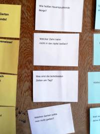Nach meiner Erfahrung macht es den Kindern wirklich Spaß. Bei den Rätseln ist die Antwort immer auf der Rückseite: feuerspuckende Berge-Vulkane, Garten den man nicht gießt-Kindergarten, Zahn, welcher nicht in den Apfel beißt-Löwenzahn, Was sind die beliebtesten Zeiten am Tag?- die Mahlzeiten.