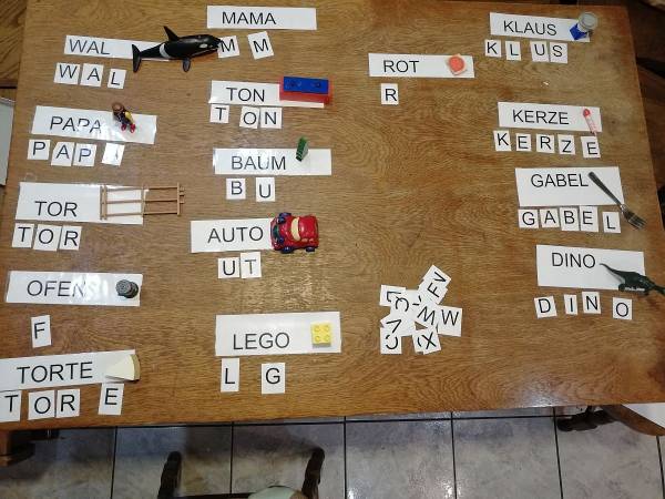 Zu Hause ist es auch eine super Beschäftigung, die Wortkarten und Buchstabenkarten sind leicht zu drucken, laminieren. Die Spielsachen dürfen wir vielleicht einfach von unseren Kindern ausleihen, aber es ist natürlich besser, wenn wir fragen:))